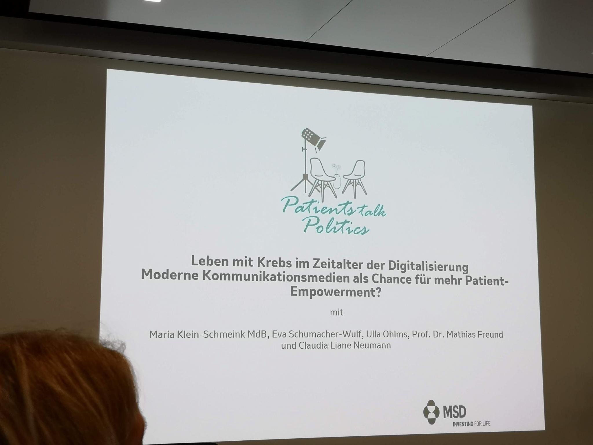Als ich eine Einladung zu einer Veranstaltung "Patients talk Politics" und dem Thema: Leben mit Krebs im Zeitalter der Digitalisierung nach Berlin erhielt, war ich natürlich sehr erfreut. Obwohl mir nicht ganz klar war, wie ich die Reise und Teilnahme gesundheitlich packe.